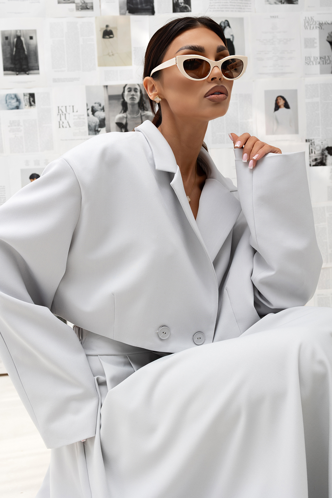 Jego oszczędna linia została przełamana charakterystyczną stójką, która nadaje sylwetce nowoczesnego, architektonicznego wyrazu. To elegancki żakiet damski, który nie potrzebuje nadmiaru — jego siła tkwi w proporcji, konstrukcji i wykończeniu.