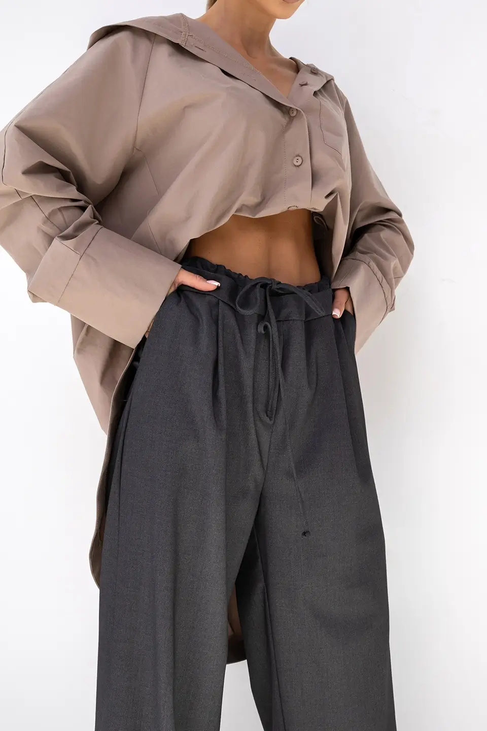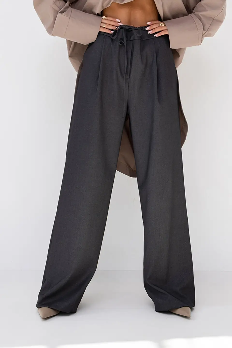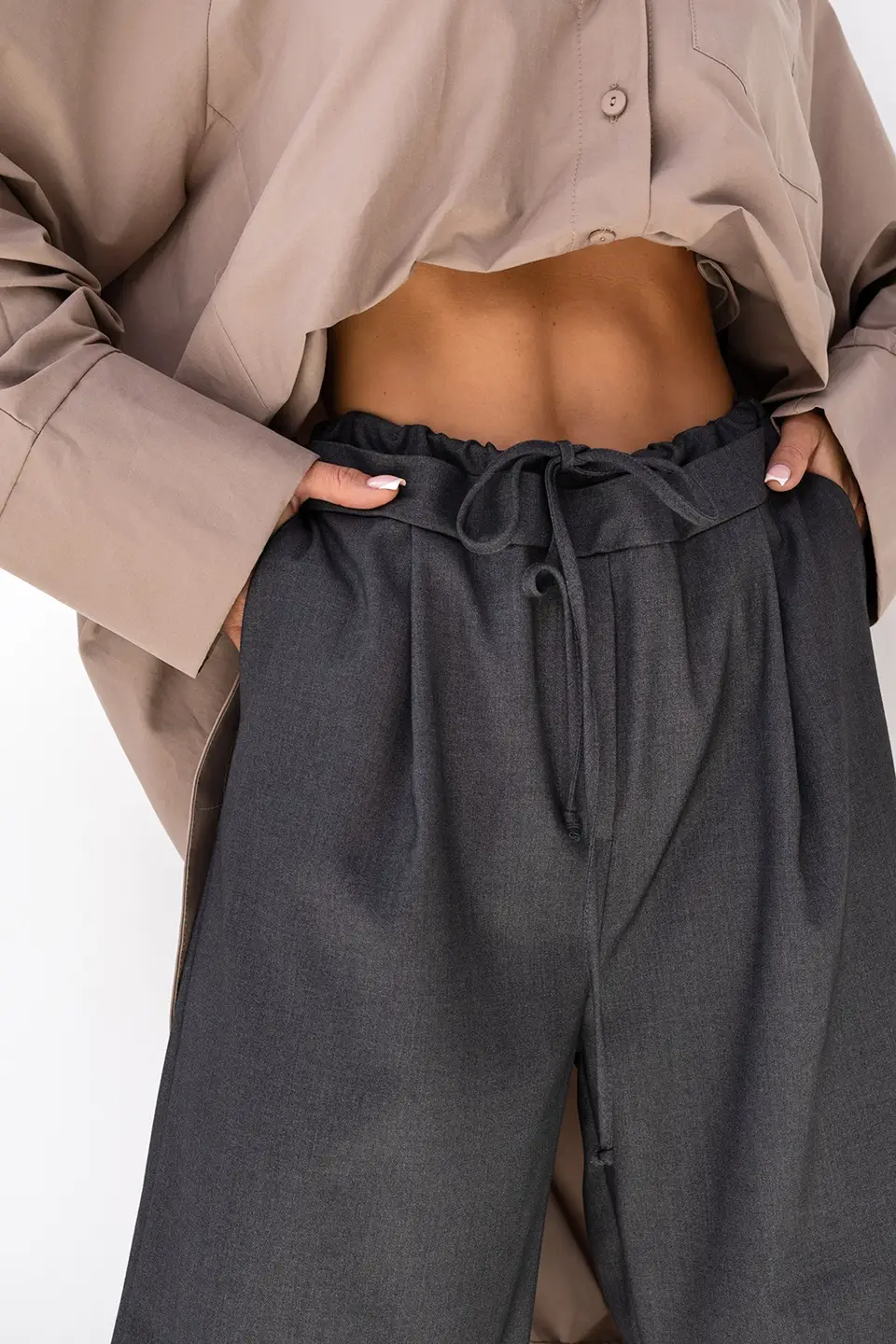 W pasie znajduje się miękka, elastyczna gumka, która dopasowuje się do sylwetki i nie uciska podczas noszenia. Dodatkowy sznurek regulacyjny pozwala precyzyjnie dopasować spodnie w talii — to idealne rozwiązanie dla kobiet, które cenią indywidualny komfort.