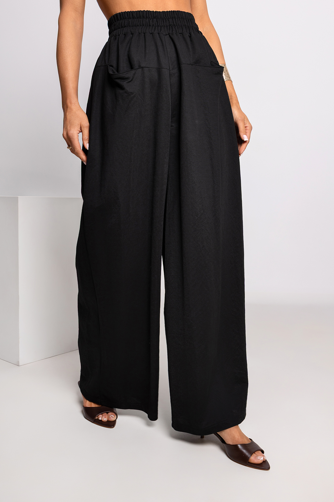 Spodnie wyróżniają się szerokimi nogawkami typu wide leg, które nadają stylizacji lekkości i eleganckiego charakteru.