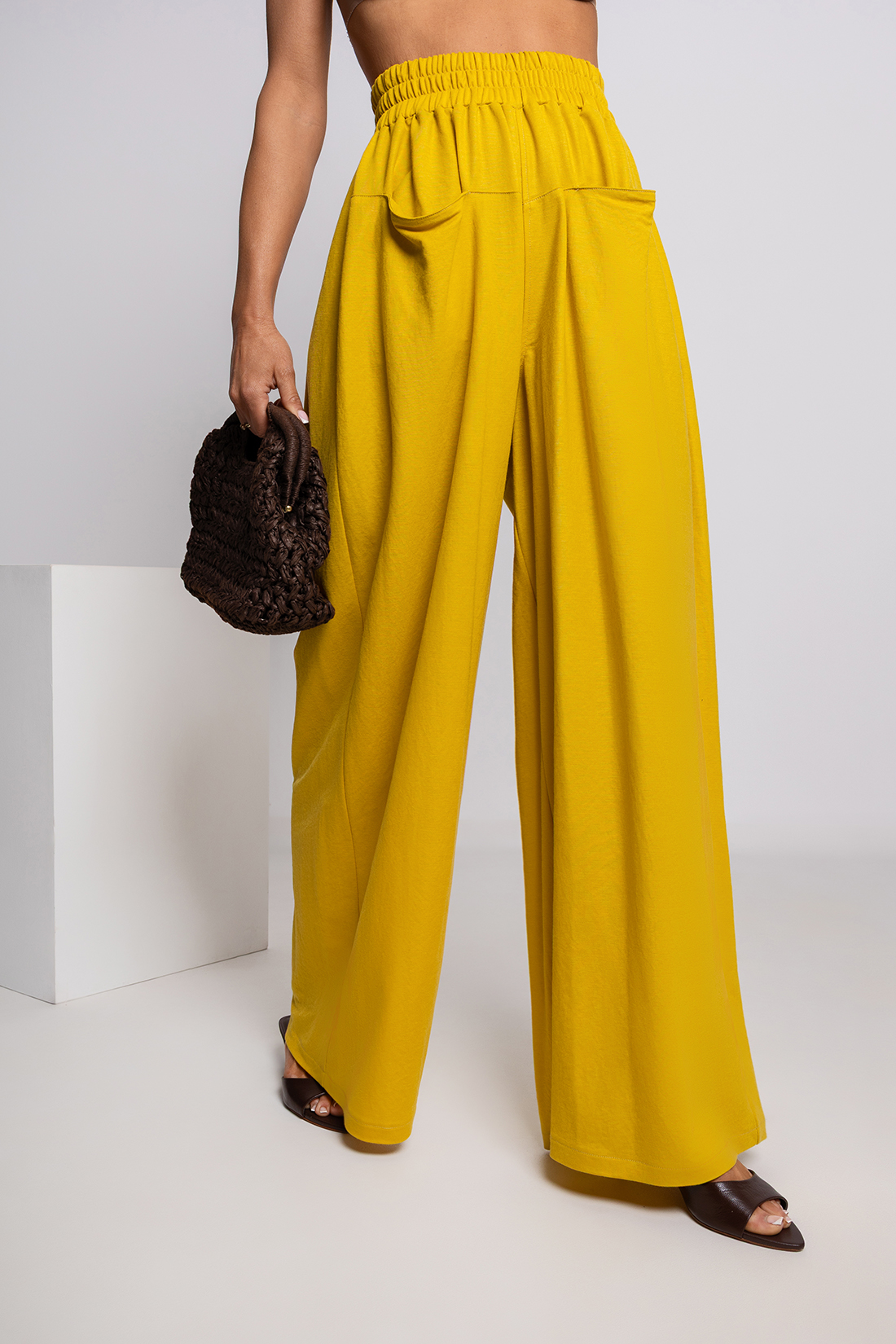 Spodnie wyróżniają się szerokimi nogawkami typu wide leg, które nadają stylizacji lekkości i eleganckiego charakteru.