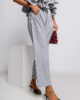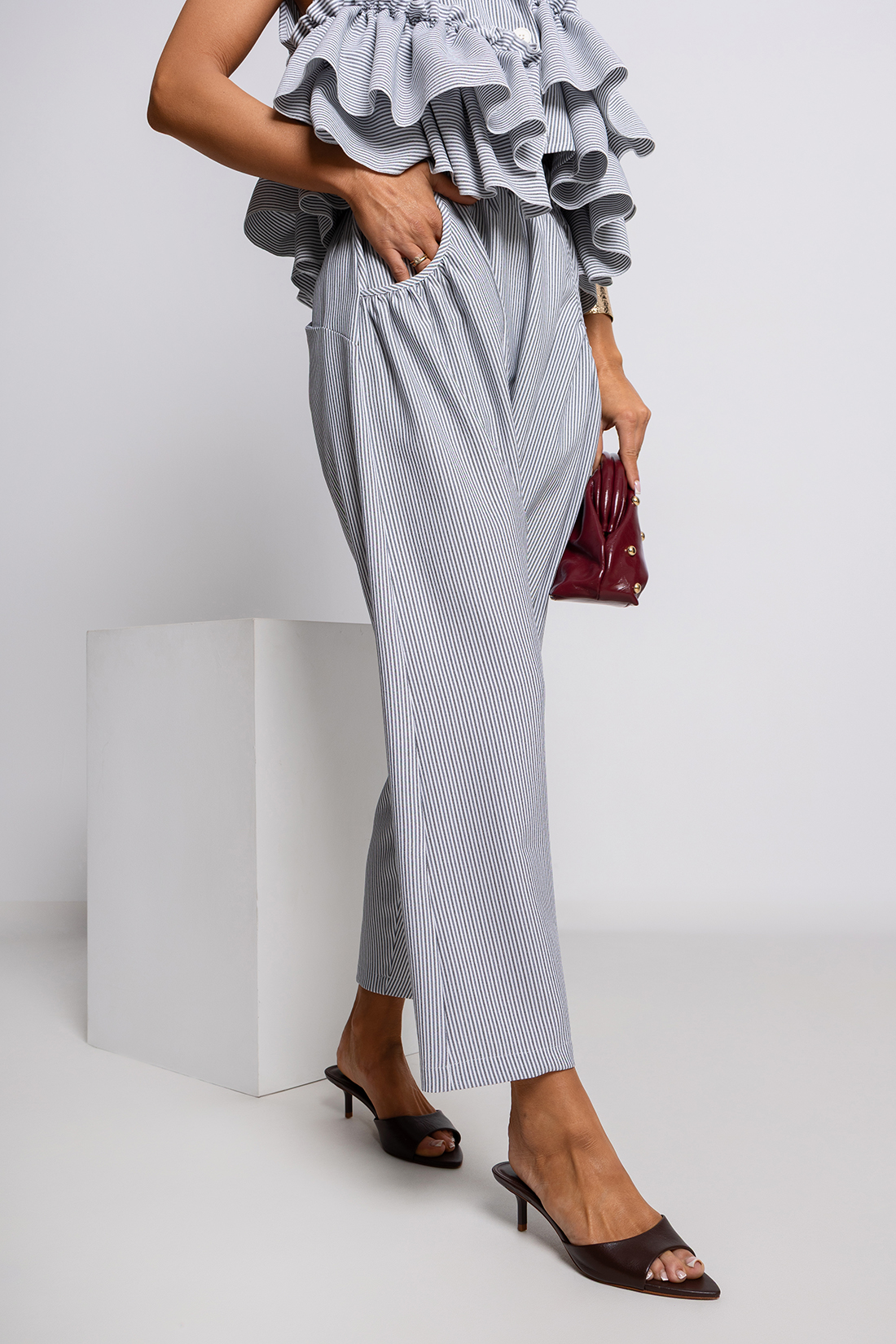 Największym atutem są efektowne falbany umieszczone na wysokości talii, które tworzą delikatną, rozkloszowaną formę. Ten detal pięknie podkreśla sylwetkę, dodając jej lekkości i dziewczęcego uroku. Pionowe paski w stonowanej kolorystyce – połączenie bieli, różu i szarości – optycznie wysmuklają figurę i nadają całości nowoczesnego charakteru.