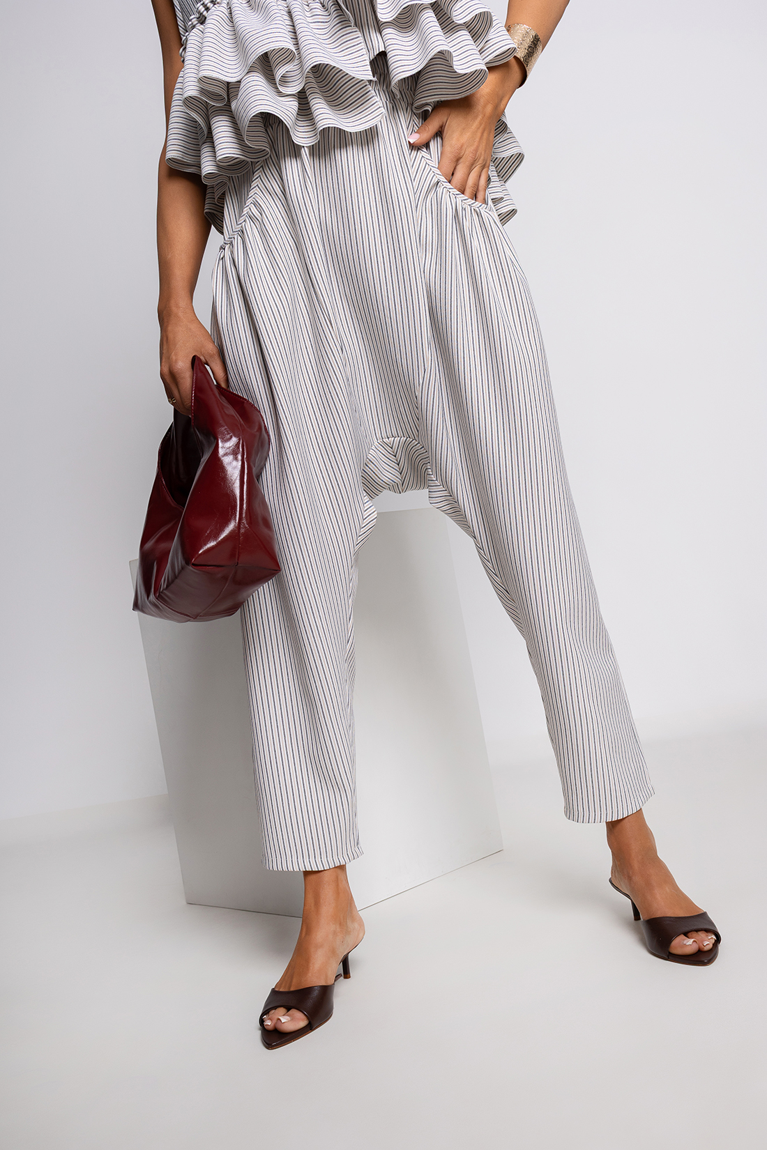 Największym atutem są efektowne falbany umieszczone na wysokości talii, które tworzą delikatną, rozkloszowaną formę. Ten detal pięknie podkreśla sylwetkę, dodając jej lekkości i dziewczęcego uroku. Pionowe paski w stonowanej kolorystyce – połączenie bieli, różu i szarości – optycznie wysmuklają figurę i nadają całości nowoczesnego charakteru.