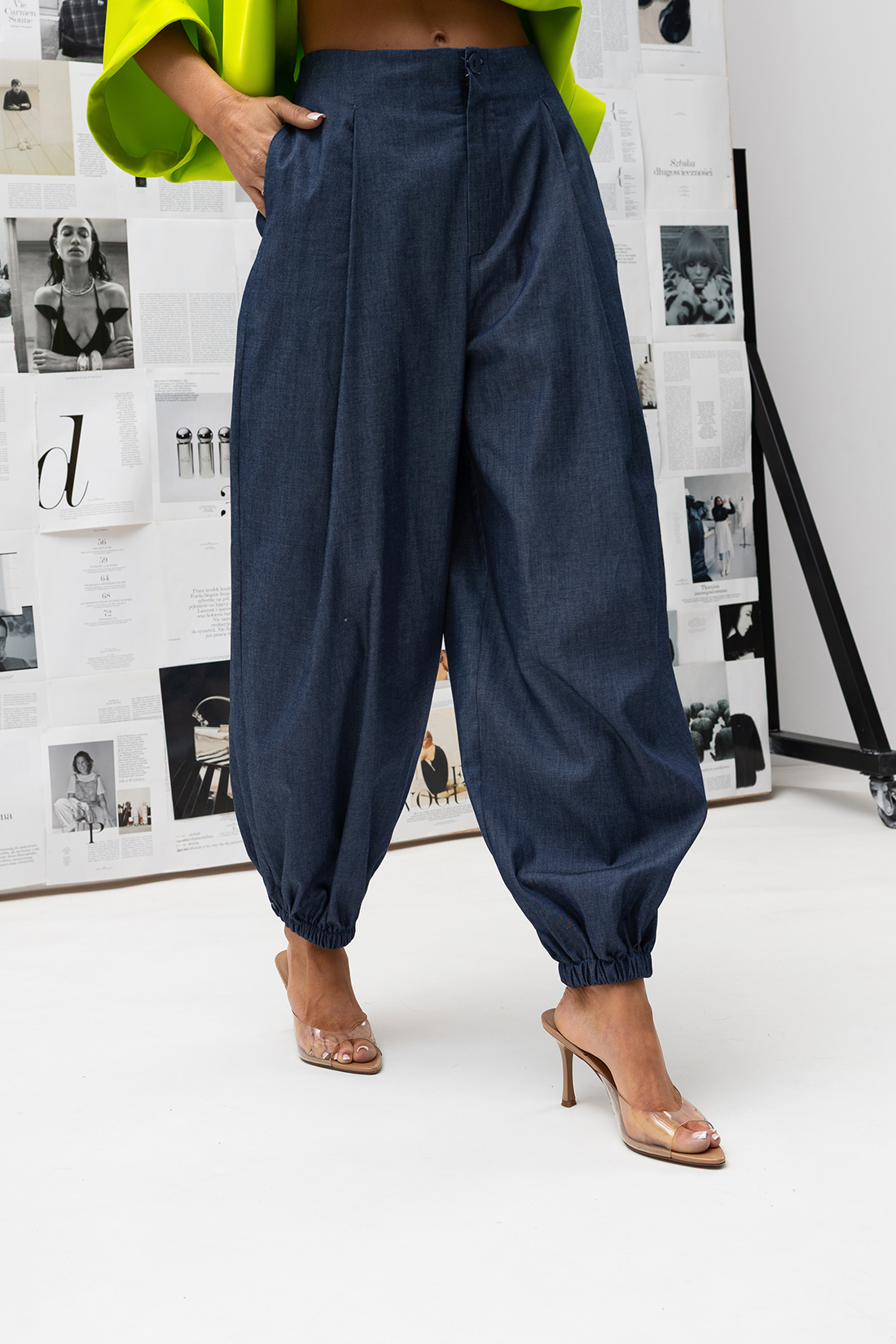 Spodnie zostały wykonane z wysokiej jakości tkaniny bawełniana imitująca jeans, co nadaje im eleganckiego wykończenia. Plisy w okolicy bioder podkreślają formę spodni, a zapięcie na guzik zapewnia estetyczne i komfortowe dopasowanie. Efektowne marszczenia na dole nogawek poprzez wykończenie w gumę stanowią modny detal, który wyróżnia ten model na tle klasycznych fasonów.