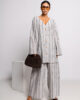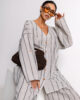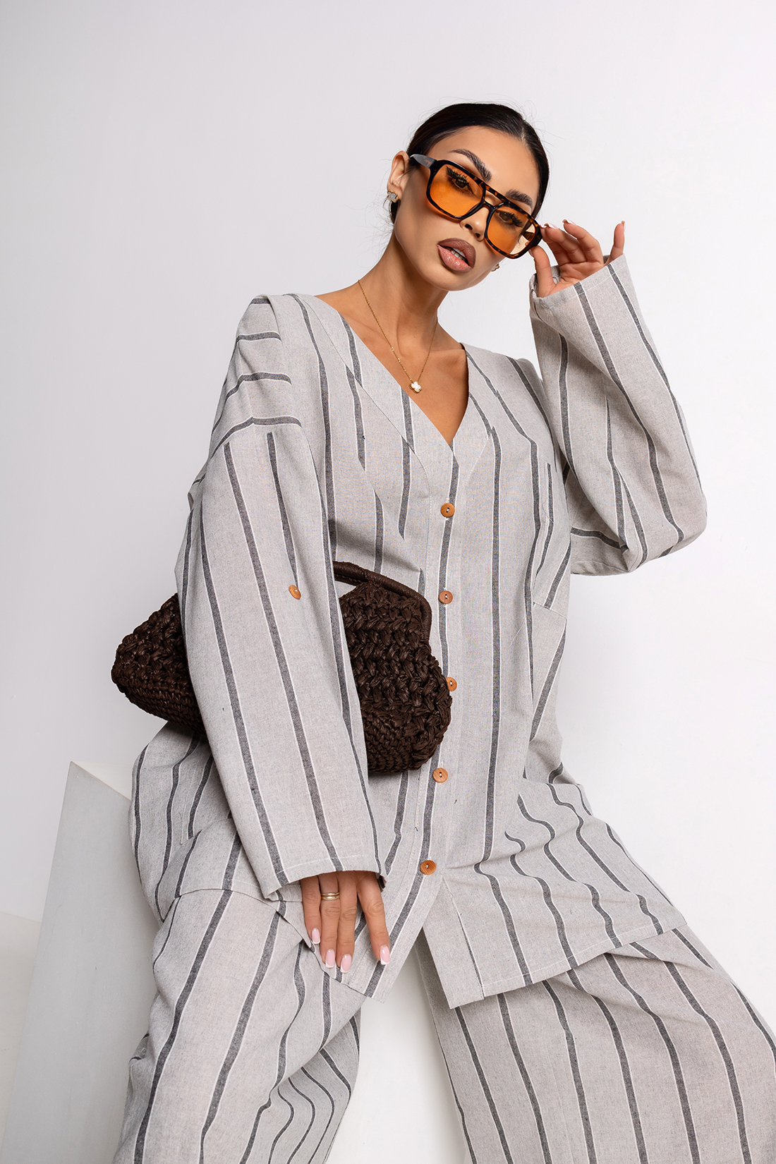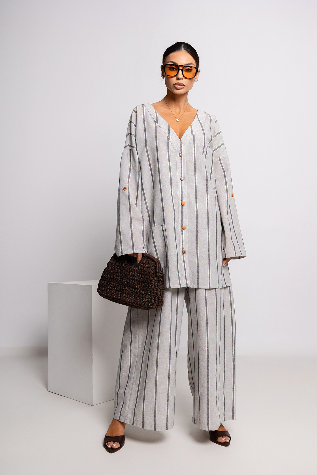 Spodnie wyróżniają się szerokimi nogawkami typu wide leg, które nadają stylizacji lekkości i eleganckiego charakteru. Wzór w pionowe paski optycznie wydłuża nogi i wysmukla sylwetkę, co czyni ten model wyjątkowo korzystnym wizualnie.