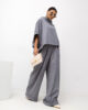 Spodnie posiadają szeroki fason z delikatnym kantem, który optycznie wydłuża nogi i korzystnie podkreśla sylwetkę. Elastyczny pas z szeroką gumą zapewnia doskonałe dopasowanie i wygodę przez cały dzień. Praktyczne kieszenie o oryginalnym wykończeniu dodają całości charakteru i miejskiego luzu.