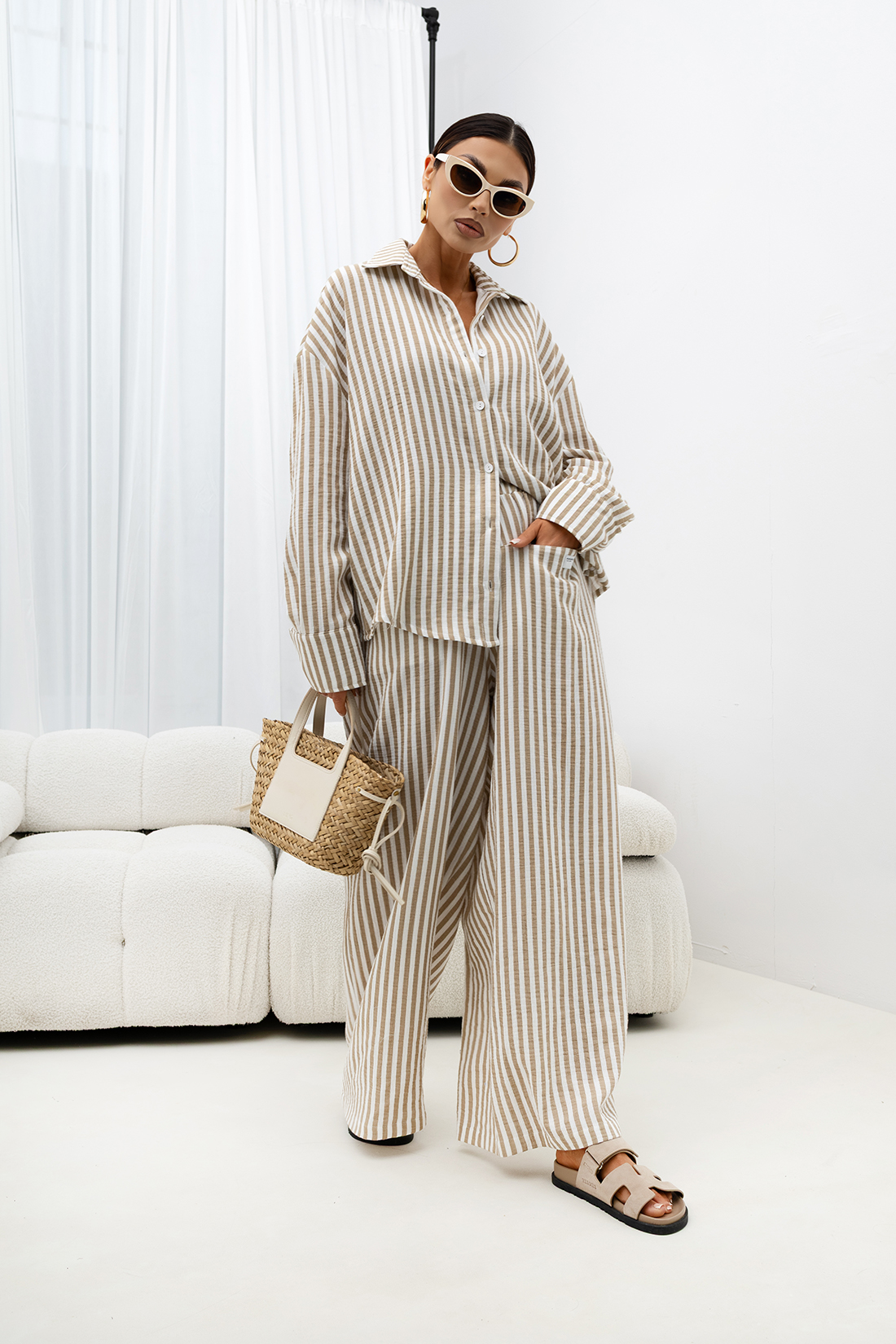 Spodnie wyróżniają się szerokimi nogawkami typu wide leg, które nadają stylizacji lekkości i eleganckiego charakteru. Wzór w pionowe paski optycznie wydłuża nogi i wysmukla sylwetkę, co czyni ten model wyjątkowo korzystnym wizualnie.