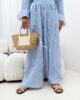 Spodnie wyróżniają się szerokimi nogawkami typu wide leg, które nadają stylizacji lekkości i eleganckiego charakteru. Wzór w pionowe paski optycznie wydłuża nogi i wysmukla sylwetkę, co czyni ten model wyjątkowo korzystnym wizualnie.