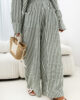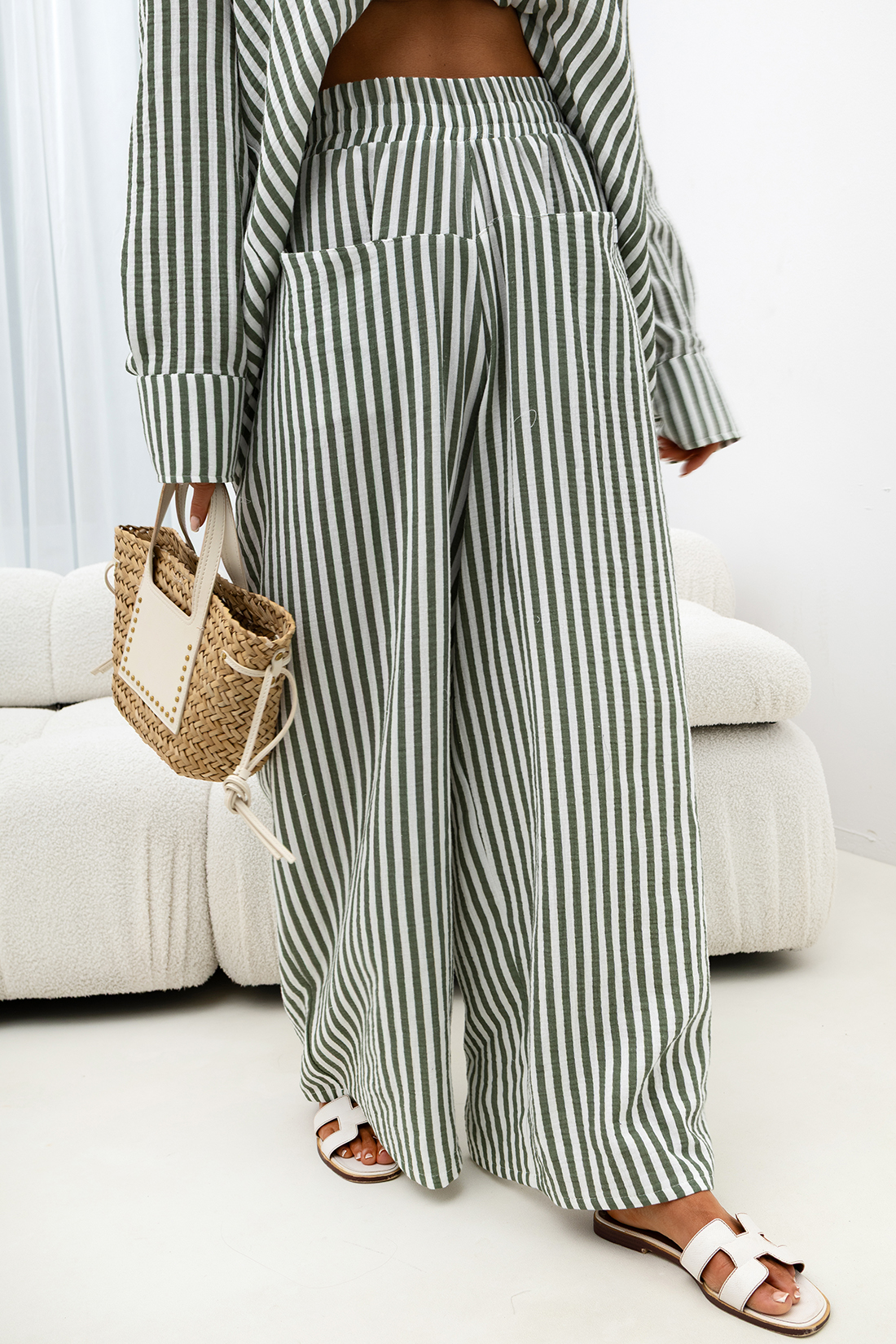 Spodnie wyróżniają się szerokimi nogawkami typu wide leg, które nadają stylizacji lekkości i eleganckiego charakteru. Wzór w pionowe paski optycznie wydłuża nogi i wysmukla sylwetkę, co czyni ten model wyjątkowo korzystnym wizualnie.