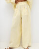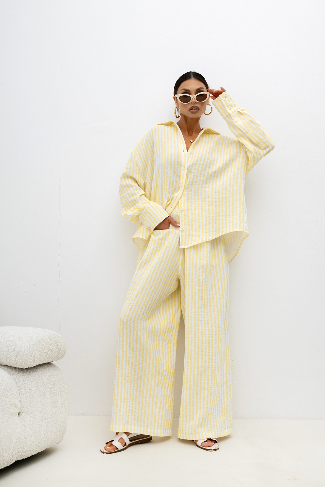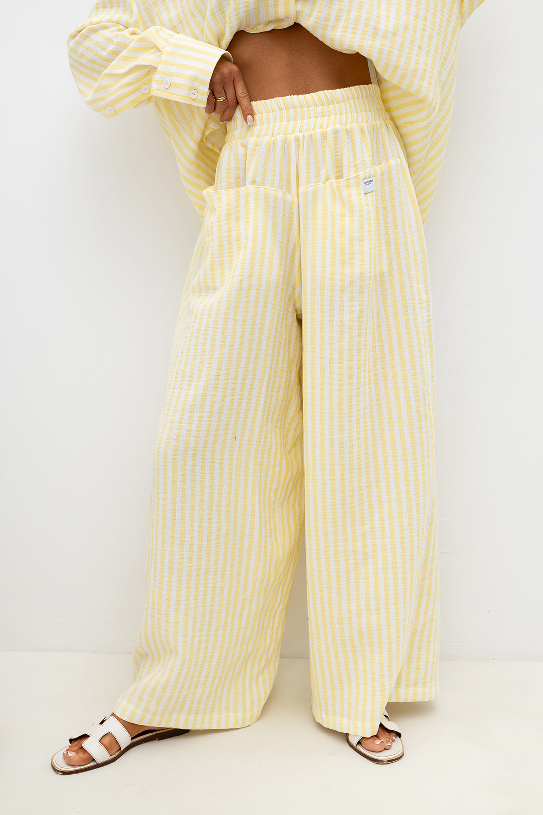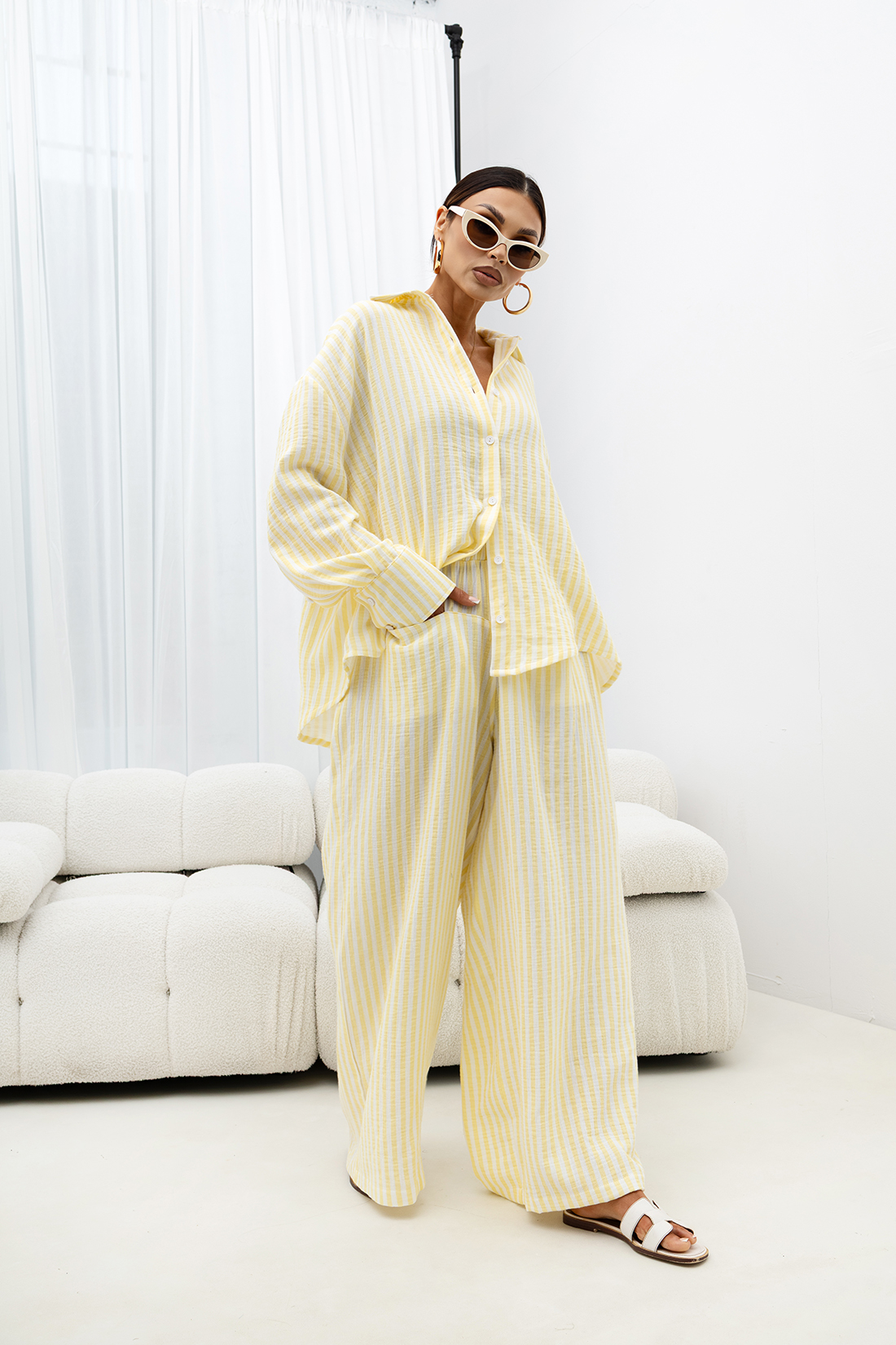 Spodnie wyróżniają się szerokimi nogawkami typu wide leg, które nadają stylizacji lekkości i eleganckiego charakteru. Wzór w pionowe paski optycznie wydłuża nogi i wysmukla sylwetkę, co czyni ten model wyjątkowo korzystnym wizualnie.