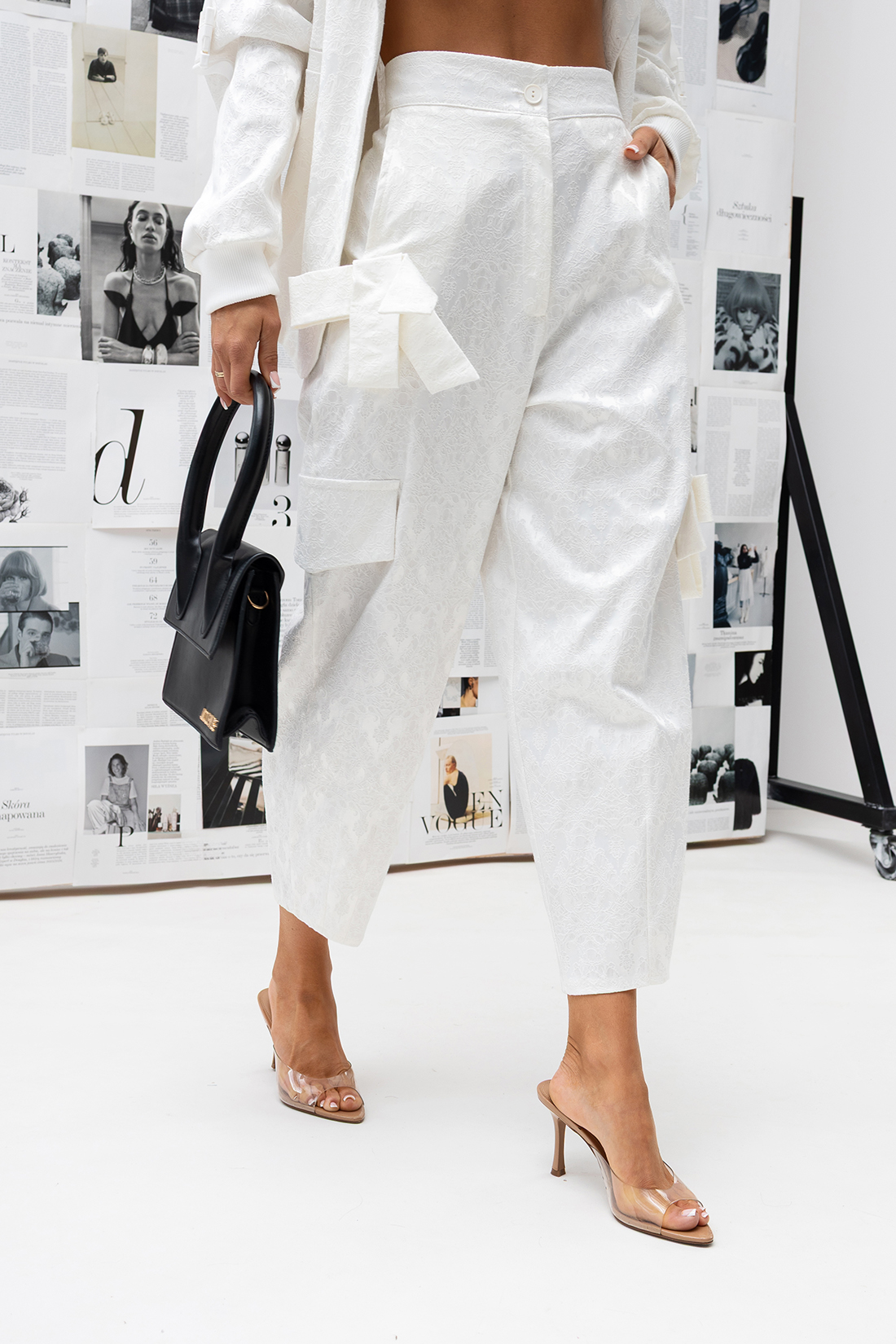 Wykonane z wysokiej jakości żakardu, pięknie układają się na sylwetce, nadając stylizacji uporządkowaną, elegancką formę. Ich dopracowany krój sprawia, że spodnie doskonale sprawdzą się zarówno w komplecie, jak i noszone samodzielnie.