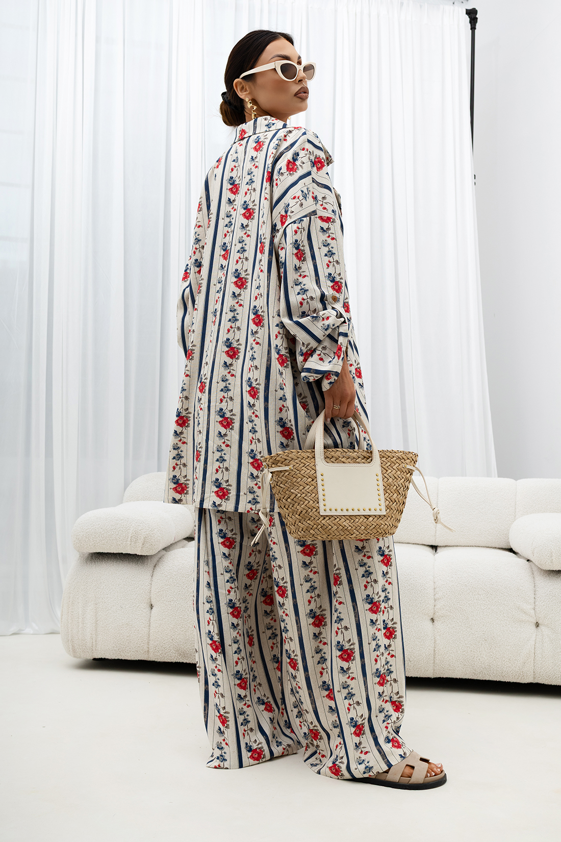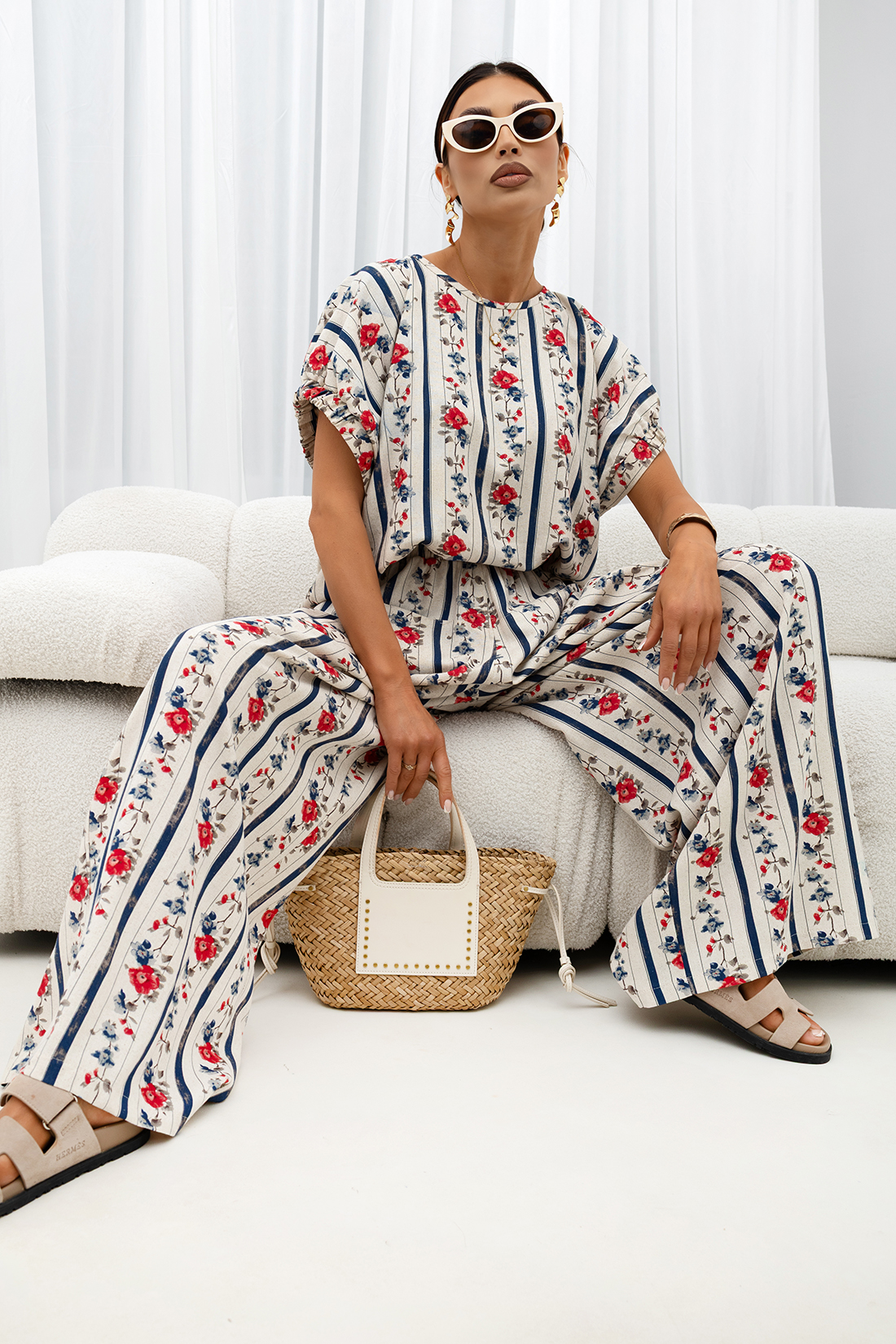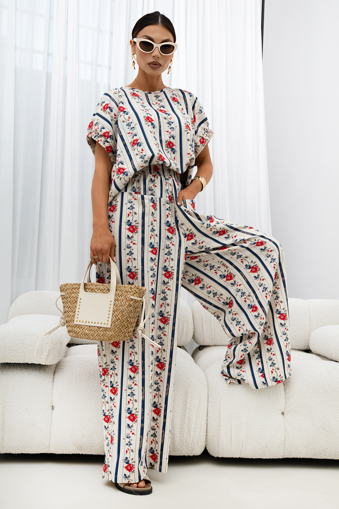Model wykonany z lekkiej, przewiewnej tkaniny, doskonale sprawdzi się w cieplejsze dni, zapewniając uczucie świeżości przez cały dzień. Materiał jest przyjemny dla skóry i miękko układa się na sylwetce, podkreślając jej naturalne proporcje.
