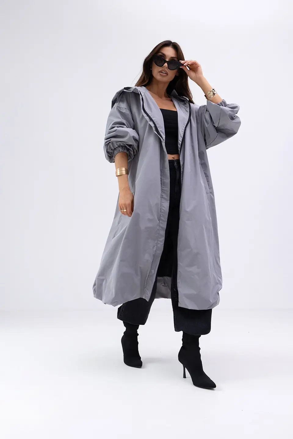 Płaszcz został wykonany z wysokiej jakości, trwałego materiału o właściwościach wodoodpornych, który skutecznie chroni przed deszczem i wiatrem. Luźny fason typu oversize gwarantuje swobodę ruchów oraz komfort noszenia, a także umożliwia zakładanie cieplejszych warstw pod spód – idealne rozwiązanie na chłodniejsze dni.