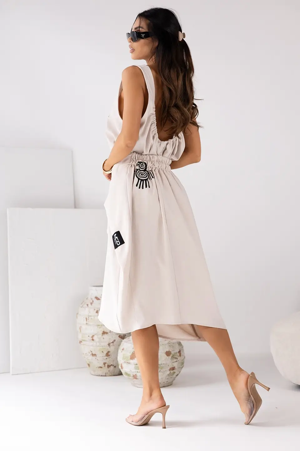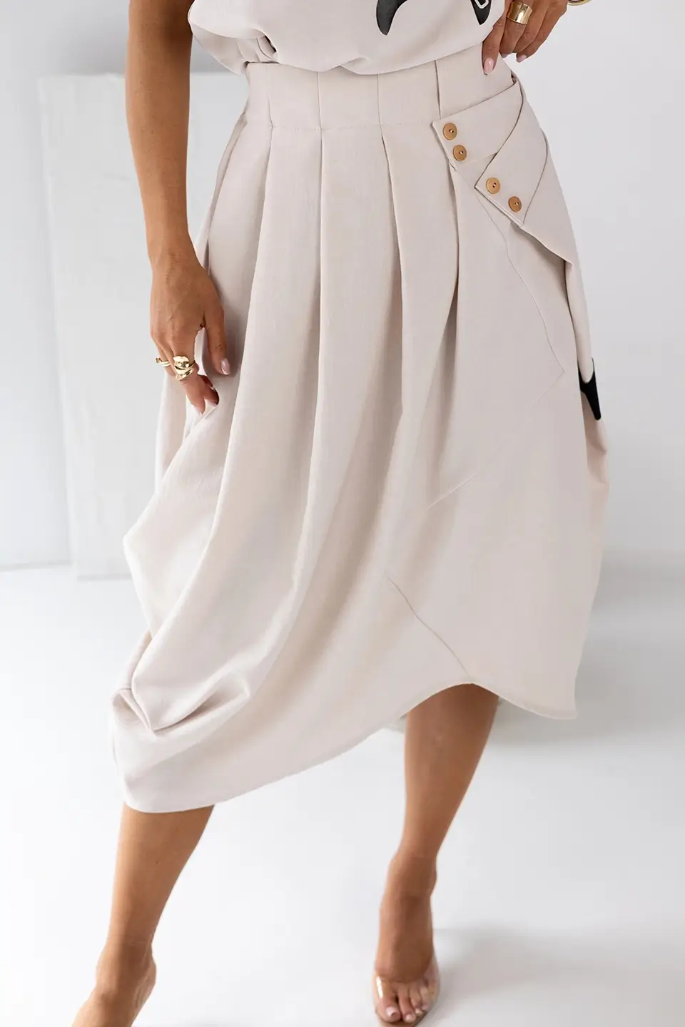 Fason tulipana subtelnie podkreśla talię i biodra, tworząc piękną sylwetkę. Drewniane guziki z przodu dodają jej naturalnego, boho charakteru. Świetnie komponuje się z prostym topem i sandałami, tworząc stylizację, którą pokochasz za wygodę i efektowny wygląd.