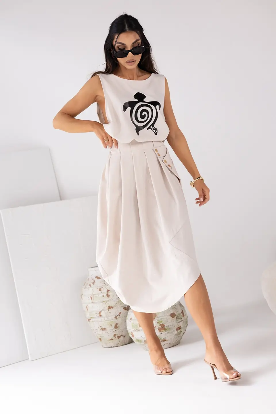 Ta przewiewna spódnica z naturalnym lnem to idealny wybór na ciepłe dni – do pracy, na spacer, a nawet na letnie spotkanie w mieście.