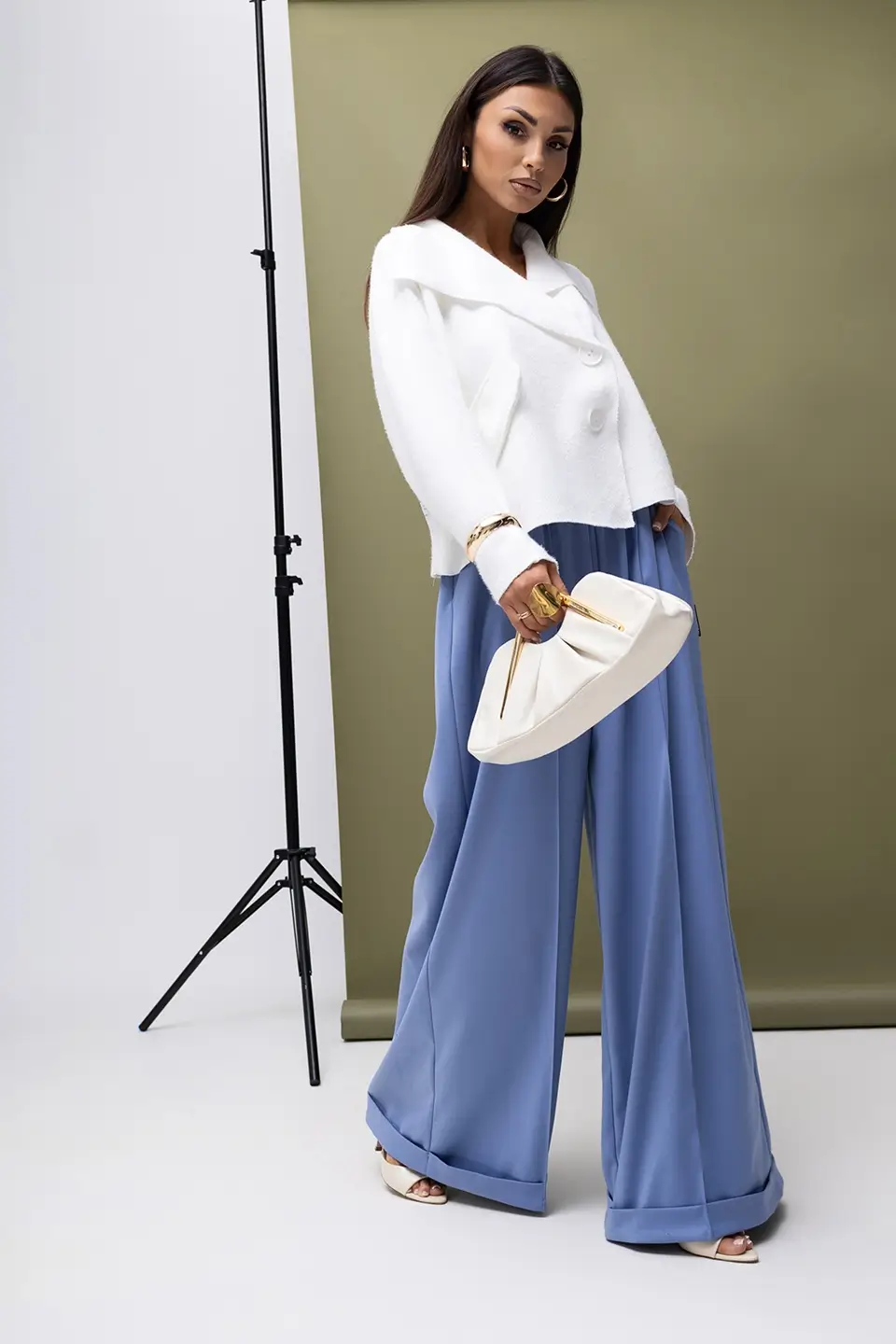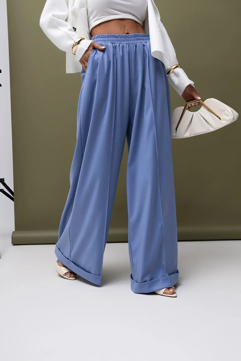- Fason: Szerokie spodnie w kant, które świetnie podkreślają sylwetkę.