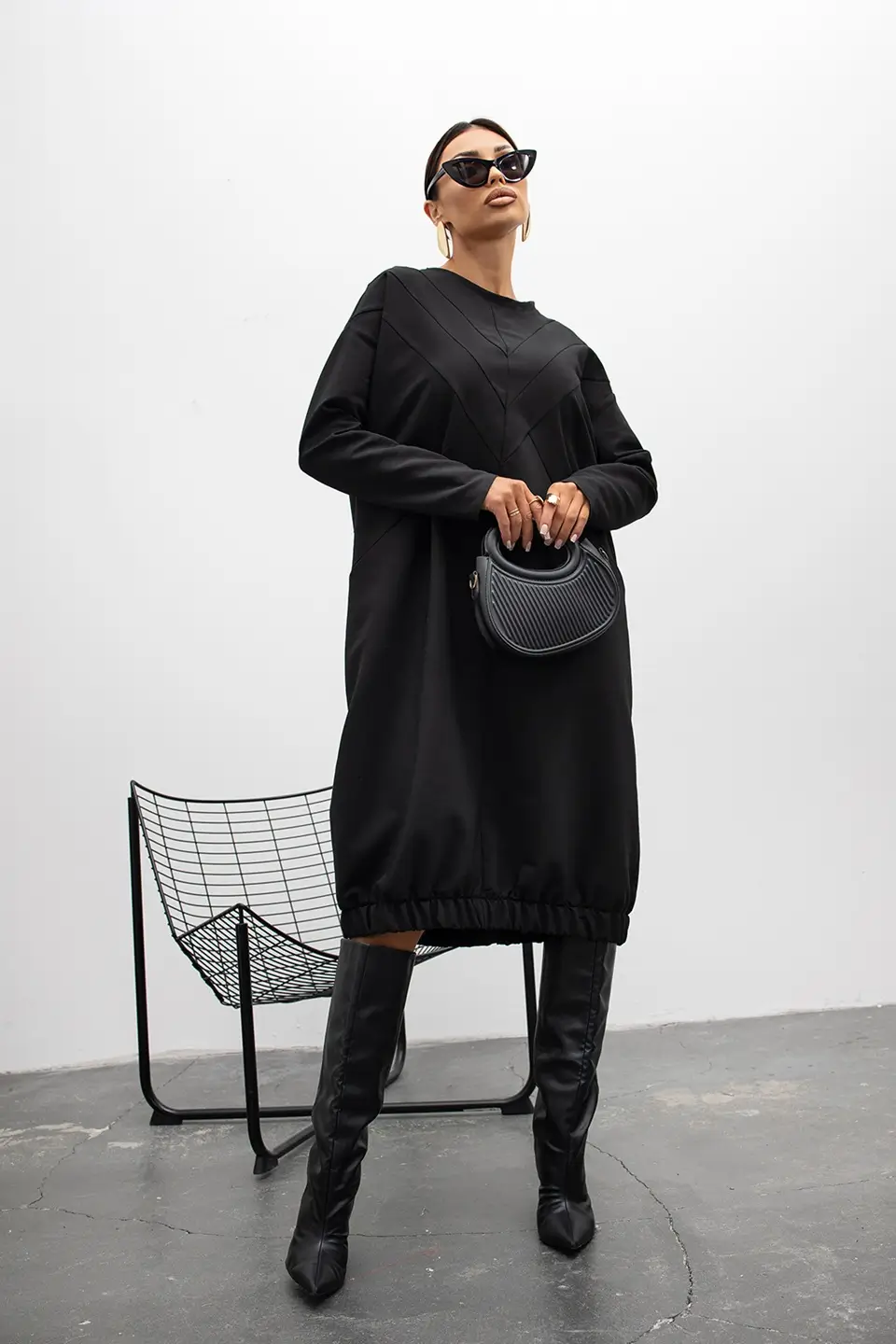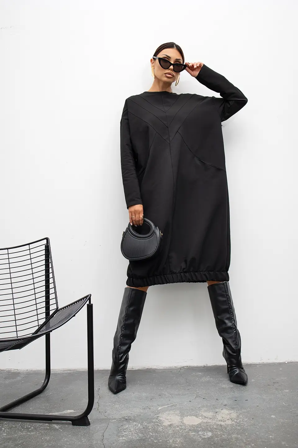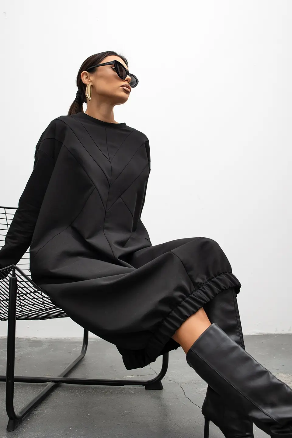 Model wyróżnia się luźnym, komfortowym krojem oraz geometrycznymi przeszyciami, które subtelnie modelują sylwetkę. To sukienka, która nie potrzebuje wielu dodatków – jej forma sama gra pierwsze skrzypce.