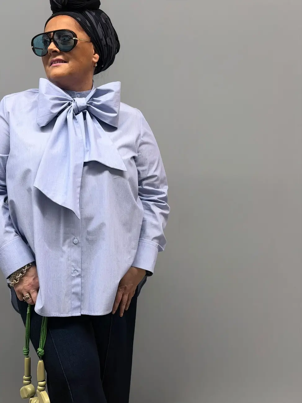 Koszula została uszyta z wysokogatunkowej, klasycznej bawełny, znanej z męskich koszul – dzięki temu jest elegancka, trwała i oddychająca, a przy tym nosi w sobie nutę pewności siebie. Przy dekolcie zastosowano delikatną stójkę, do której doszyta została szarfa umożliwiająca stworzenie imponującej dużej kokardy lub stylowego długiego krawata – w zależności od nastroju i okazji.