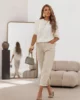 Bluzeczka posiada modny, luźniejszy splot, który pięknie pracuje na sylwetce i nadaje całości lekkości. Krótkie rękawy oraz klasyczny fason sprawiają, że model świetnie sprawdzi się zarówno w codziennych stylizacjach, jak i w bardziej eleganckim wydaniu.
