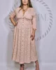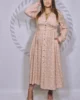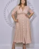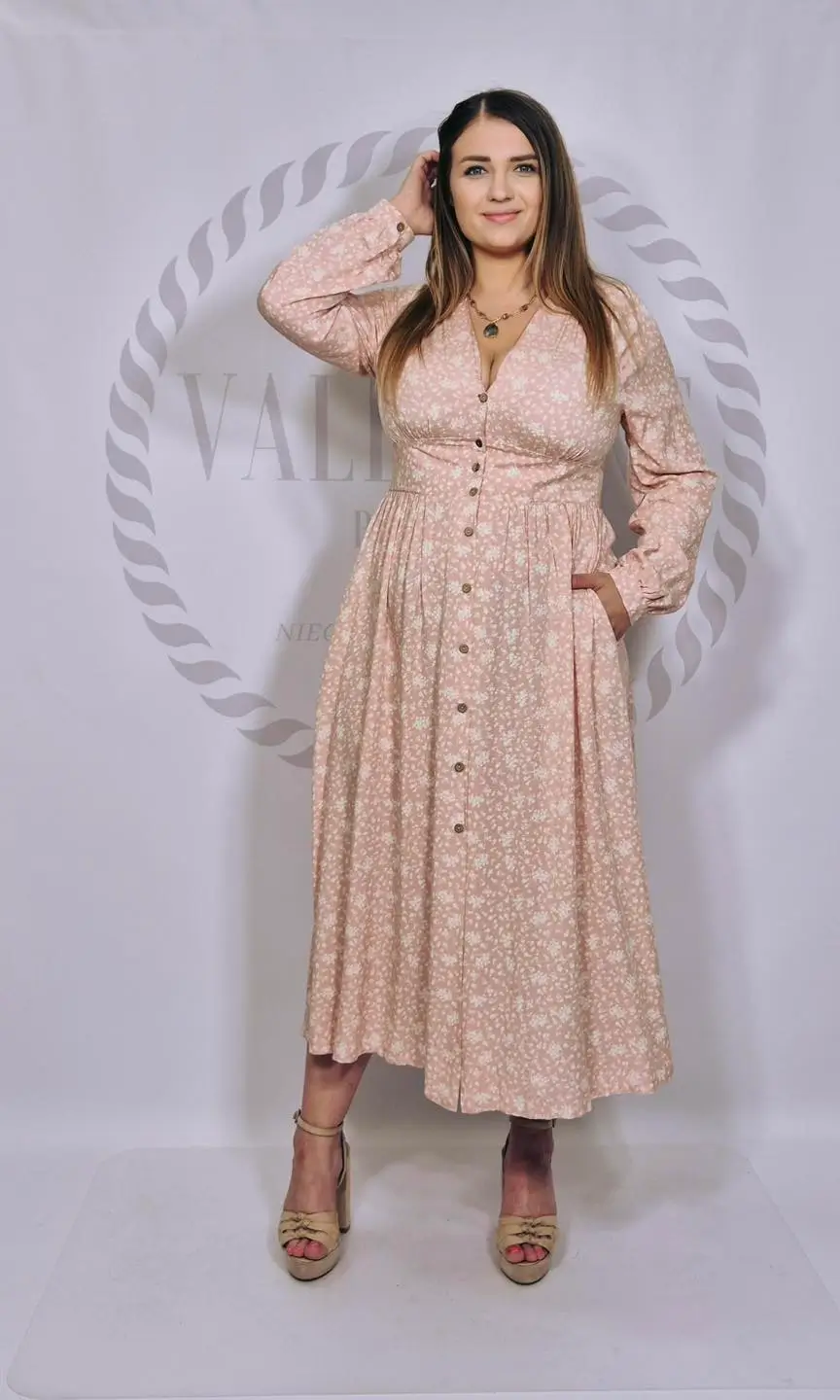 W pasie znajduje się elastyczna gumka z tyłu, która zapewnia idealne dopasowanie do talii i optycznie modeluje sylwetkę. Przód sukienki zdobią guziki na całej długości, które nie tylko pełnią funkcję praktyczną (można regulować głębokość dekoltu lub rozpiąć dolną część), ale też stanowią ozdobny, elegancki akcent. Ich rozmieszczenie zostało przemyślane tak, by optycznie wysmuklać sylwetkę i podkreślić proporcje ciała.