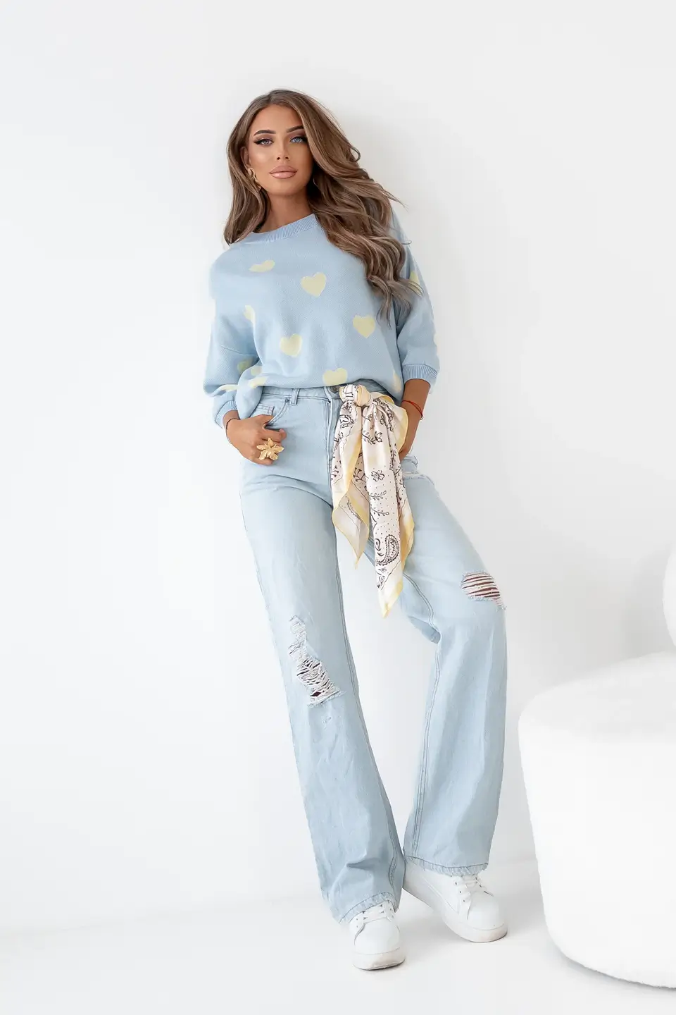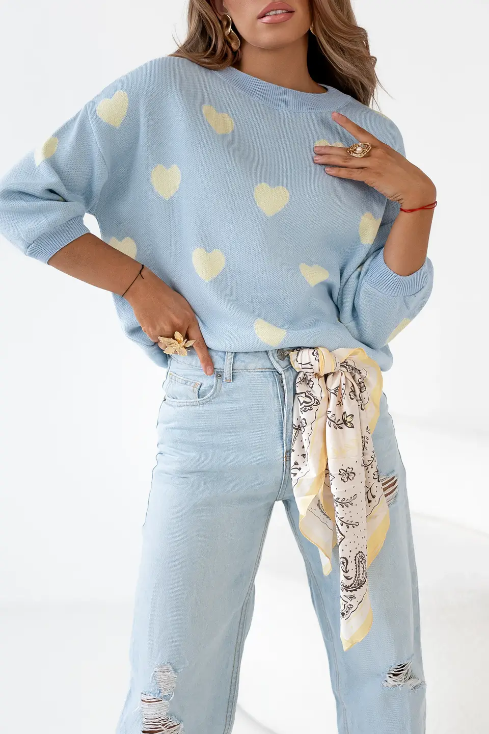 Sweterek posiada klasyczny, okrągły dekolt oraz krótkie rękawy sięgające do łokci. Dekolt, dół oraz rękawy wykończone są elastycznym ściągaczem, co zapewnia estetyczne dopasowanie i komfort noszenia. Kontrastowy wzór w serca nadaje całości dziewczęcego, romantycznego charakteru i stanowi subtelny akcent, który przyciąga uwagę.