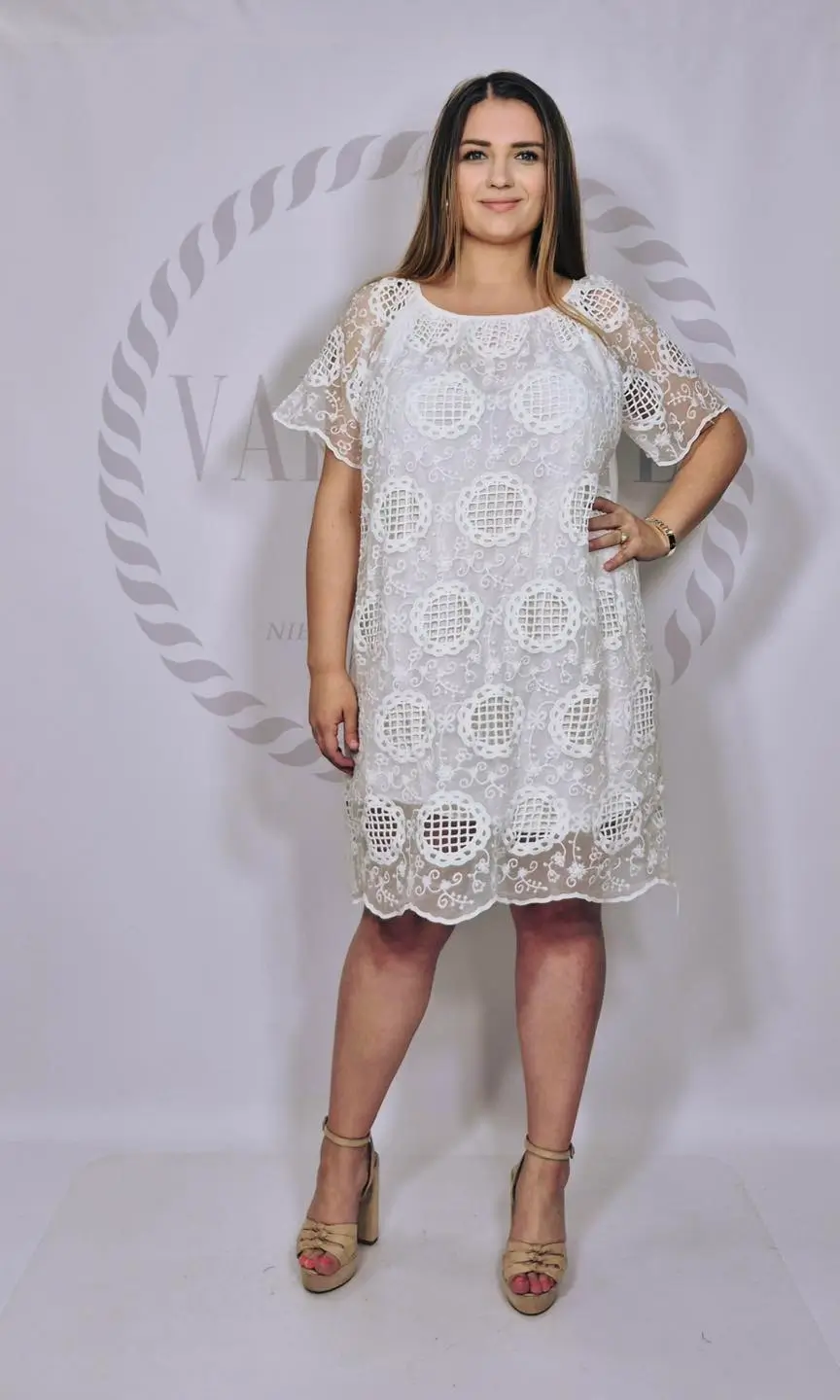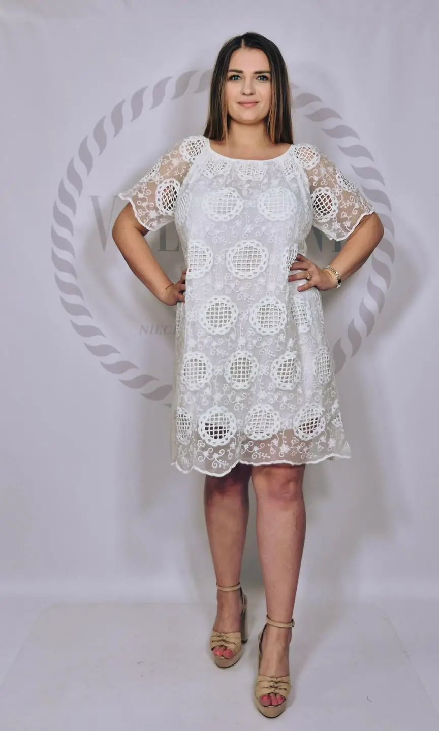 Stylowa i kobieca propozycja w duchu vintage! Ta włoska sukienka o retro kroju to połączenie romantycznej estetyki z wygodą. Wierzchnia warstwa wykonana z efektownej bawełnianej gipiury, która nadaje całości niepowtarzalnego uroku. Krótkie ażurowe rękawki podkreślają lekki i delikatny charakter modelu.